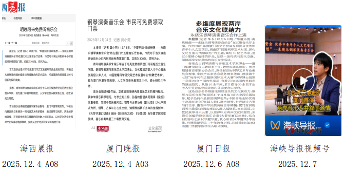 本次音乐会通过多维度媒体联动实现立体传播。厦门华厦学院官网率先发布预告推文,同步配合人文学院公众号推送;厦门文艺(含其公众号)与厦门日报、海西晨报、腾讯新闻等媒体展开深度报道;海峡导报通过抖音、快手、视频号三大新媒体渠道推送《台湾叙事曲》首演实况,全面推动两岸音乐文化交流的广泛传播与深度共鸣。