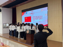 第三环节,宣读入团誓词。“我志愿加入中国共产主义青年团,坚决拥护中国共产党的领导……”在团委书记吴维闽老师的带领下,新团员们高举右拳,面向团旗庄严宣誓。他们的声音坚定有力,每一句誓言都饱含决心,现场氛围庄重而热烈。