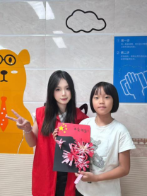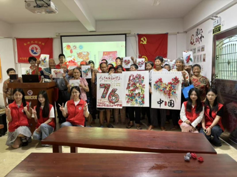 活动现场,团员志愿者与社区儿童共同参与创意手工制作,合力完成了以“华诞76周年 我爱你中国”为主题的艺术作品,用缤纷的色彩与巧思表达对祖国的热爱。同时,志愿者们还组织了国庆知识科普、红色故事分享等环节,在趣味互动中带领孩子们了解祖国发展历程,厚植家国情怀。