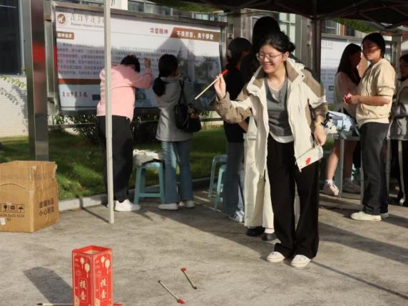 活动现场,秋日暖阳与欢声笑语交织,四大传统趣味项目分区展开,各具特色,吸引了众多学子驻足参与。“重阳投壶”中箭矢破空,铮然入盒,引来四座掌声;“茱萸香囊DIY”让同学们亲手缝制香囊,艾蒲清香满溢指尖,承载辟邪祈福的祝愿;“茱萸谜踪·团队寻迹”考验智慧与协作;“摇绳接力赛”则洋溢着青春活力与团队精神。