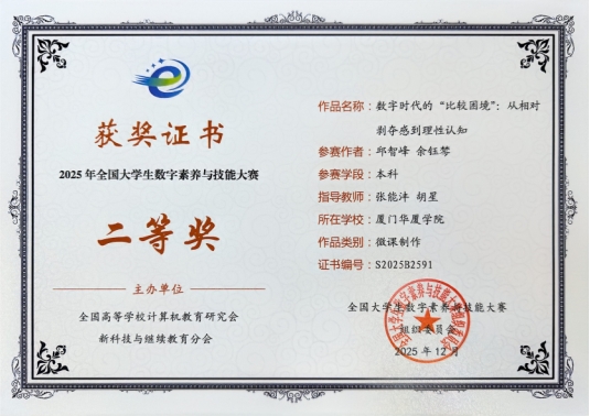 近日,2025年全国大学生数字素养与技能大赛评选结果揭晓,在胡星老师与通识中心张能沣老师的悉心指导下,我院2023级网络与新媒体1班邱智峰、2024级网络与新媒体1班余钰棽同学作品《数字时代的“比较困境”:从相对剥夺感到理性认知》荣获全国二等奖。